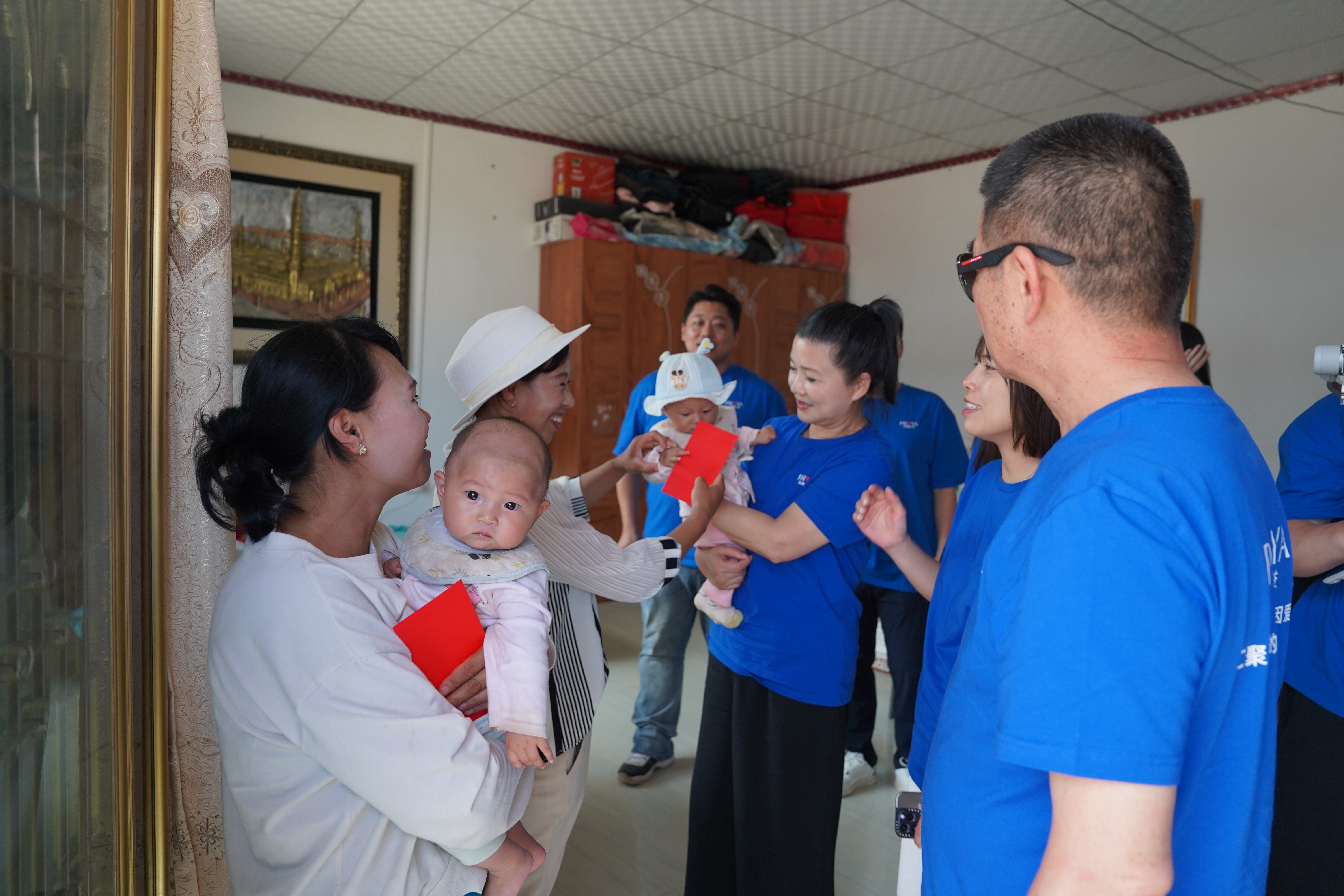 走访中,侯军呈董事长仔细了解着每一户的家庭情况,深感各个家庭的不易之处。看到襁褓中的婴儿,方理事长还亲切地抱入怀中,送上小小红包祝愿孩子健康平安地长大。