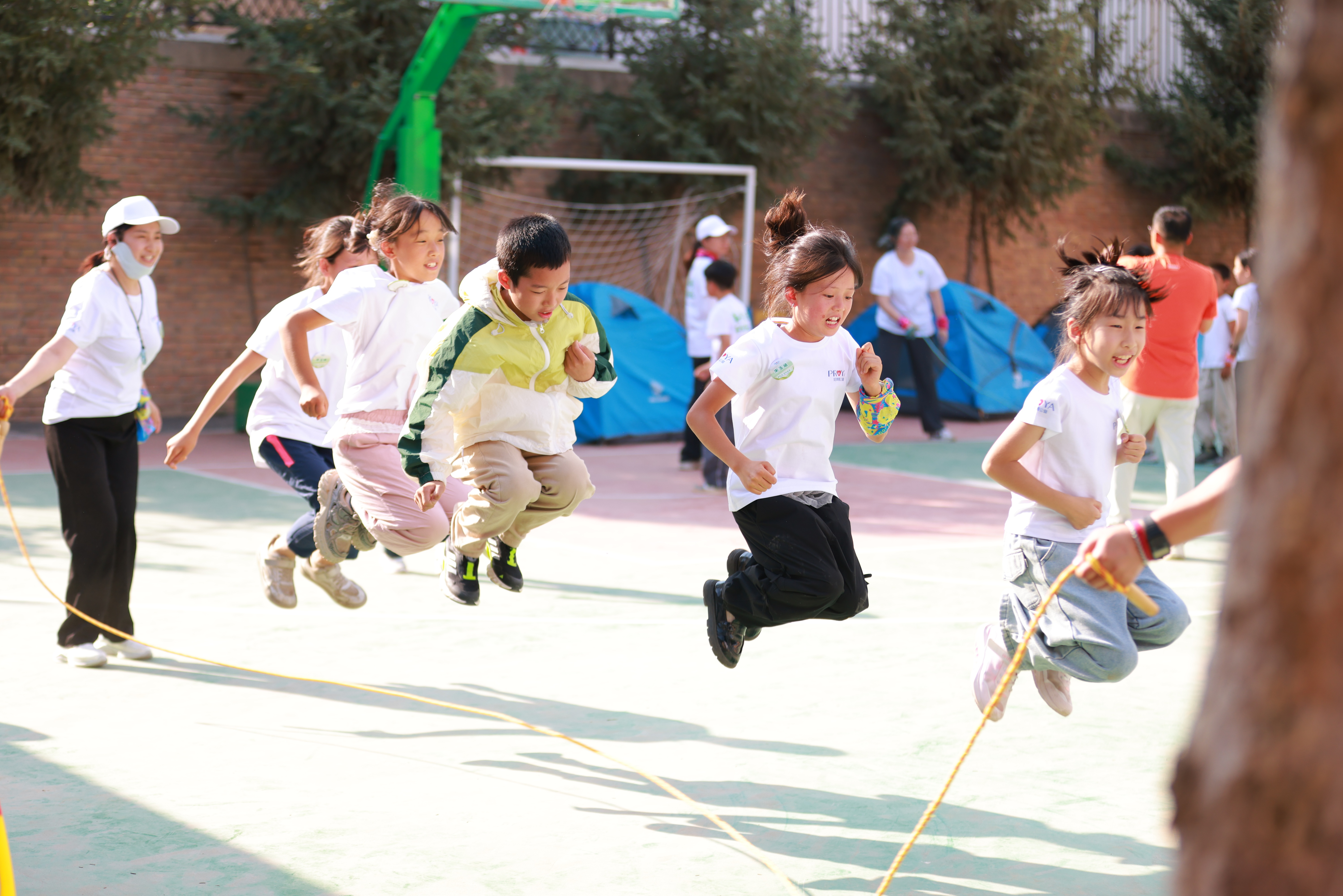操场上,黄土高原的烈日格外持久,但无法阻挡孩子们沉浸在趣味运动会中大展身手。跳大神时步调一致,投篮比赛时精准命中,接力钻呼啦圈时配合流畅。此起彼伏的加油声与欢笑声中,已经分不清孩子们来自哪里,只见一张张汗津津的笑脸在阳光下闪闪发光。