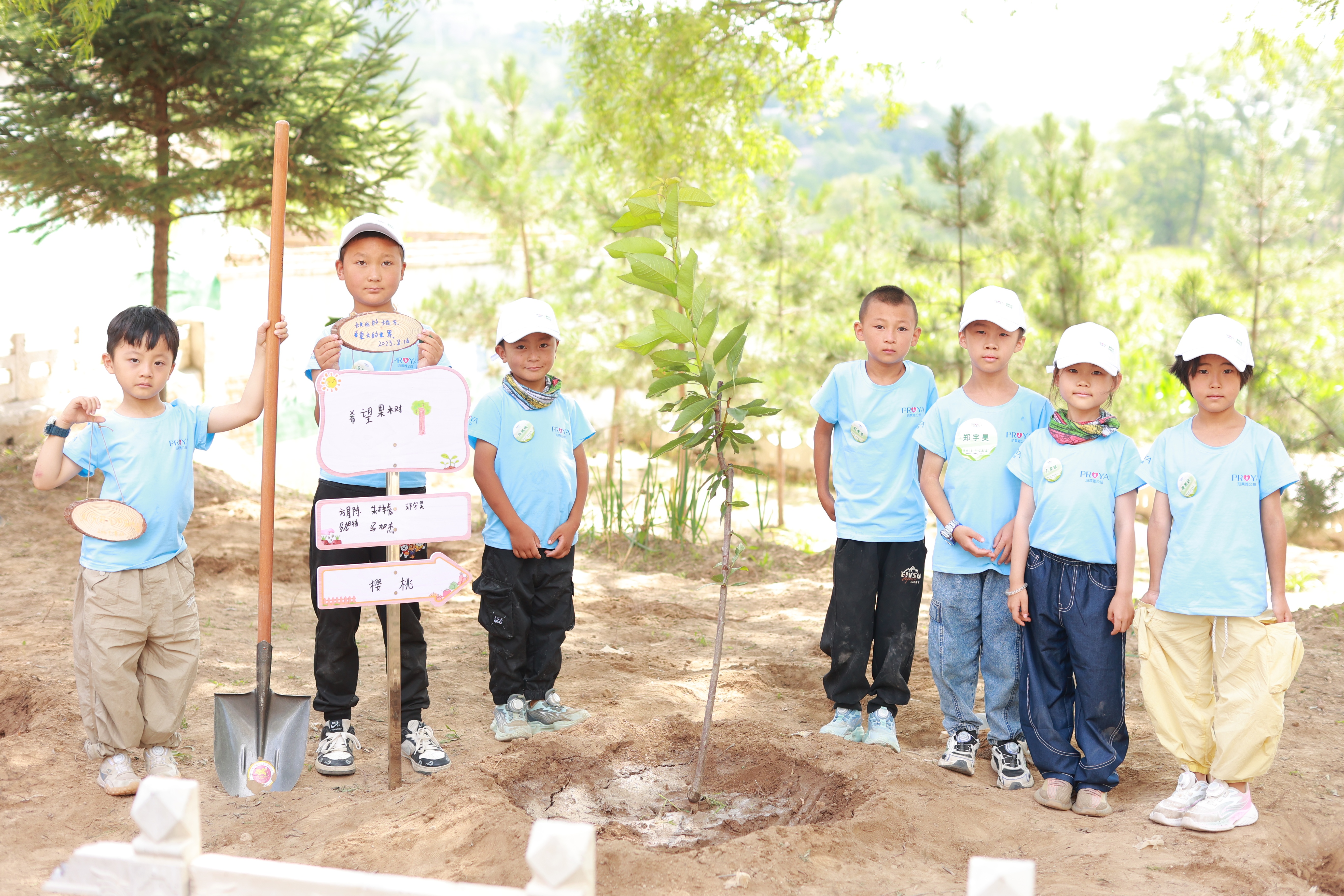 校门口,大家合力种下一棵棵樱桃树,小心翼翼地培土浇水,为小树命名,并写下充满祝福的心愿卡挂在枝头,期待着来年它能开花结果,这片感恩林成为孩子们美好情谊的见证。