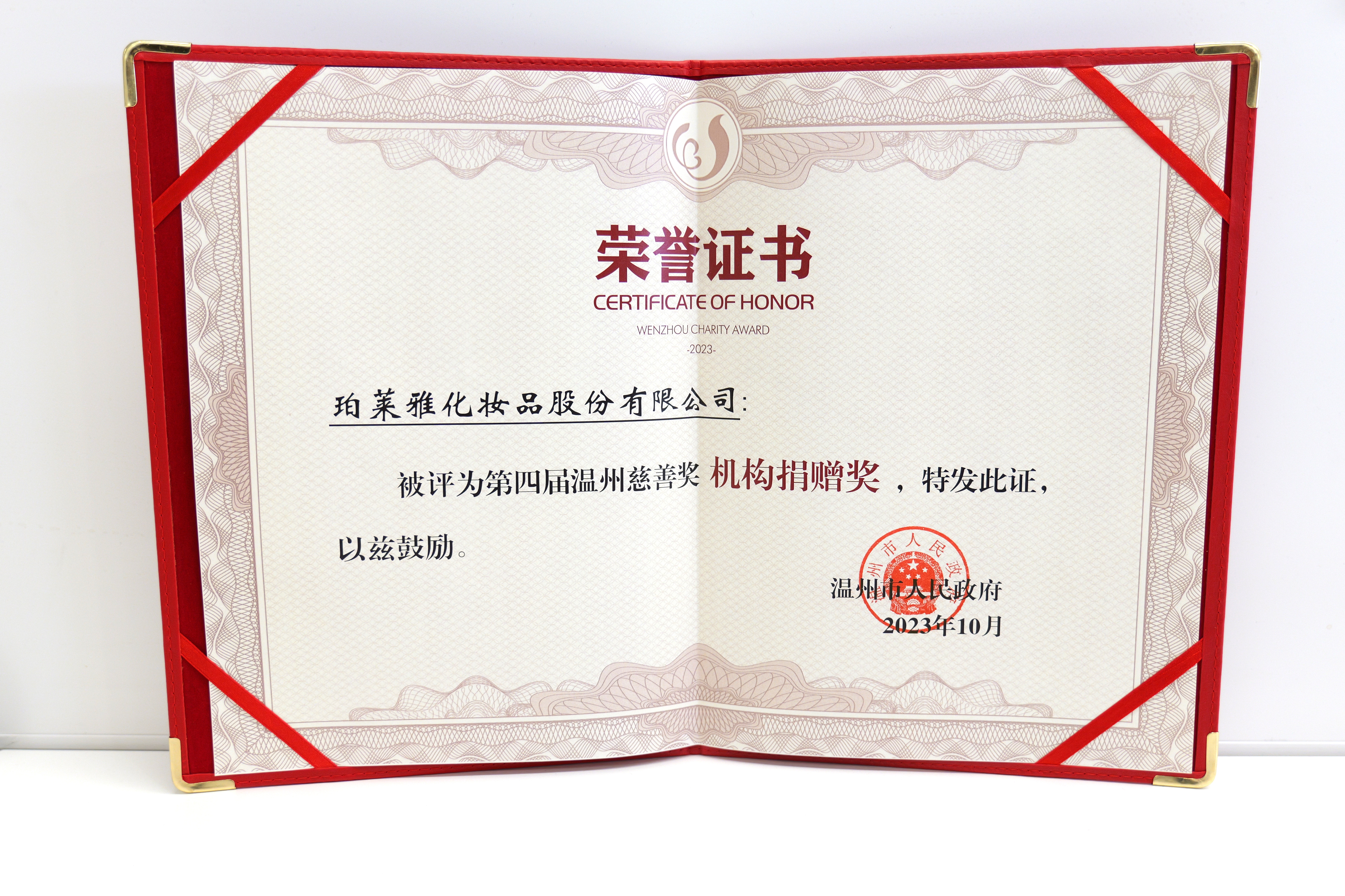 12月19日,第四届温州慈善大会在温州市人民大会堂召开。为表彰先进,鼓励带动更多社会力量支持和参与慈善事业,温州市人民政府对获得第四届“温州慈善奖”的单位、个人和项目给予通报表扬。珀莱雅荣获第四届“温州慈善奖”机构捐赠奖。