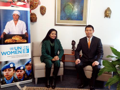 此外,纽约时间3月5日上午,联合国总部官员还在会前特邀方玉友先生,共同探讨企业如何以创新思维帮助女性迎接职场挑战。妇女署执行副主任Lakshmi Puri女士热情地为方玉友先生介绍了诸多解决女性就业挑战的国际潮流思路。