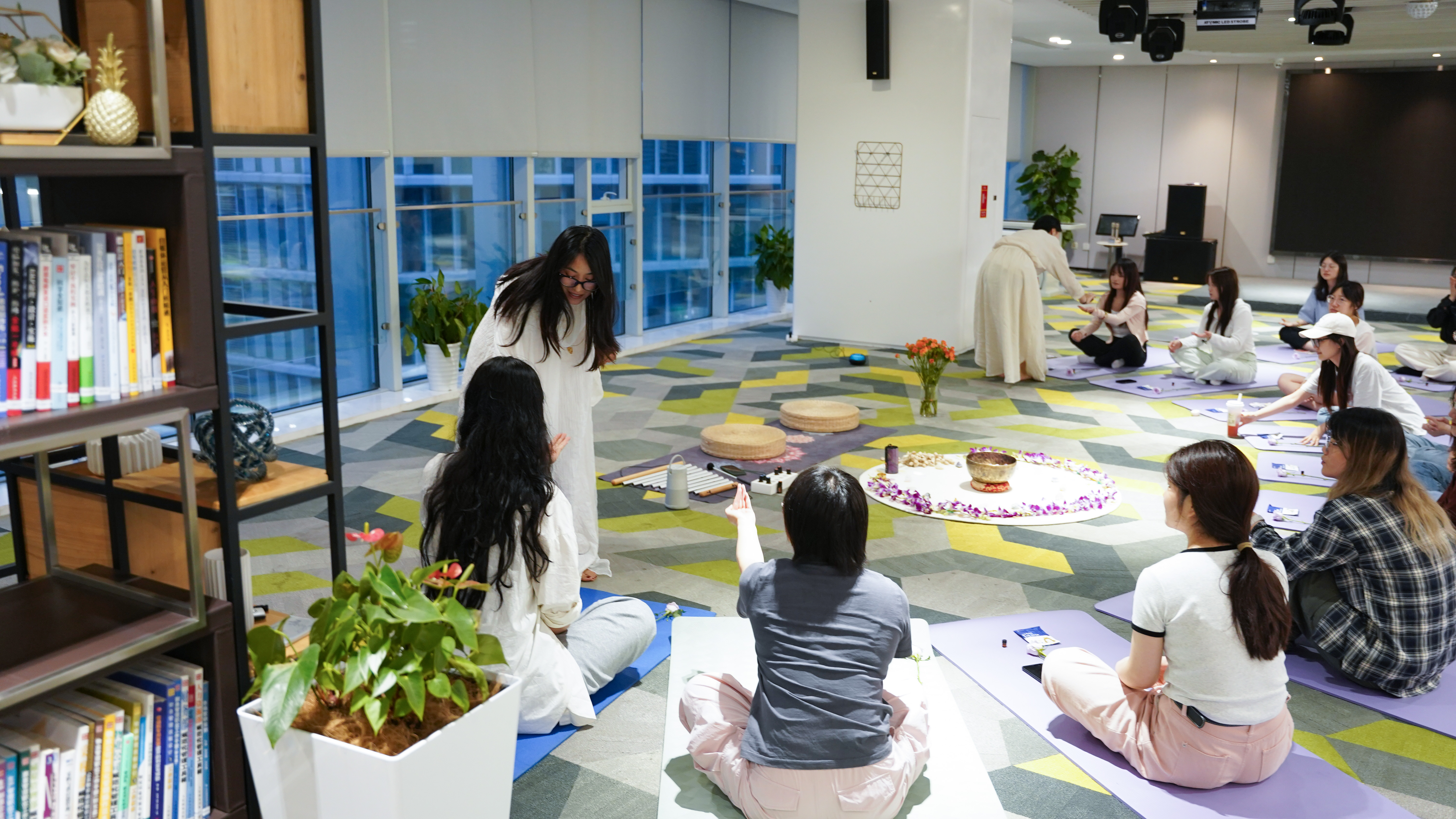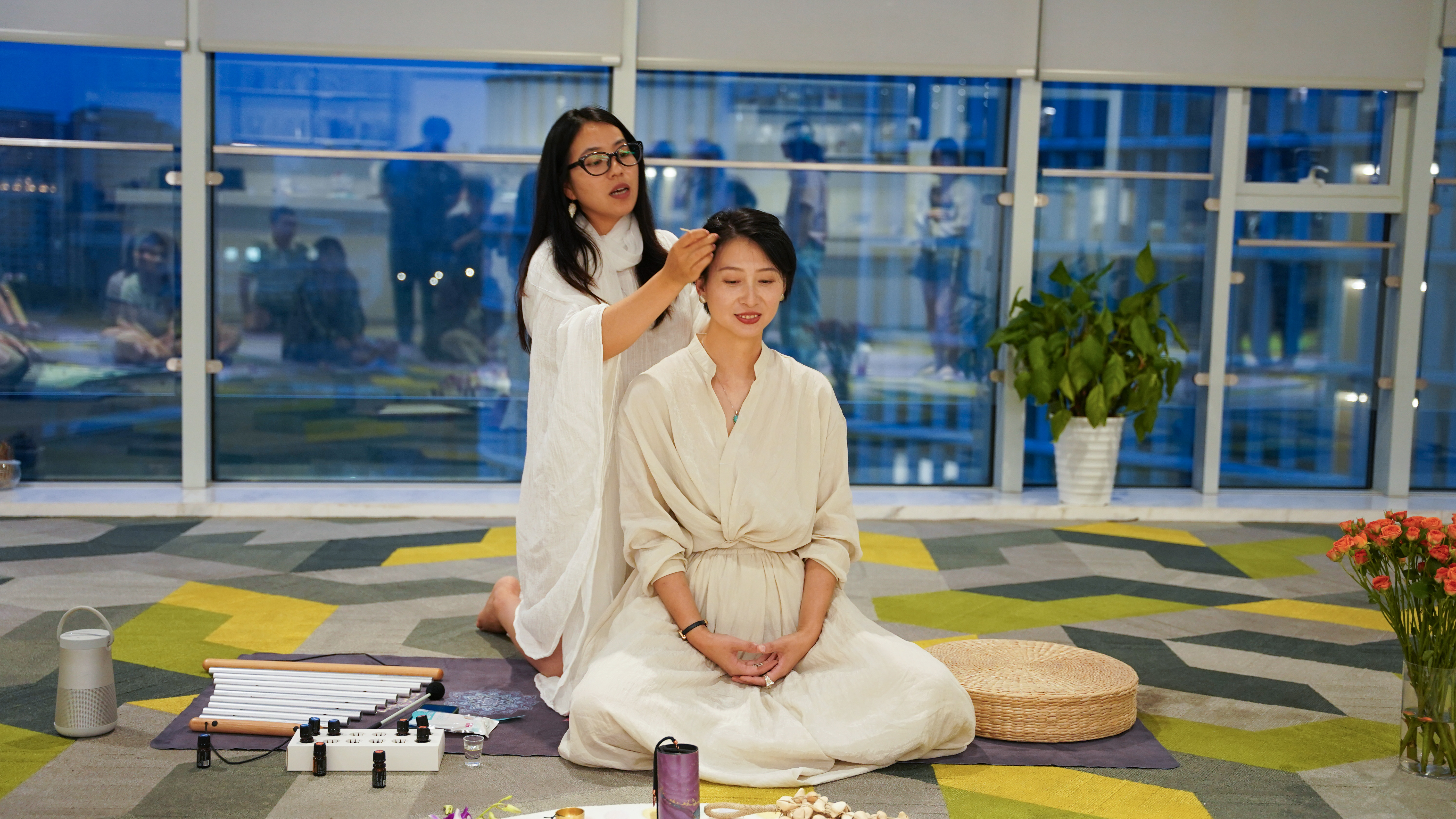 芬芳体验从闻嗅开启,昏暗的灯光下,配合舒缓的音乐混合着手摇音束的空灵和手摇铃果清脆的声音,共同营造出一种自然轻灵的氛围。戴上蒸汽眼罩的小伙伴们听从着老师轻柔声音的指引慢慢放松身体,嗅着精油的芳香,不久,呼声渐起,小伙伴们在五感六觉中找到了内心的宁静。